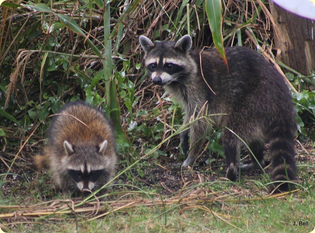 Then this afternoon, the raccoon made an appearance and brought two youngsters with her. The young ones were a little shy and skittish to begin with, but soon adjusted.